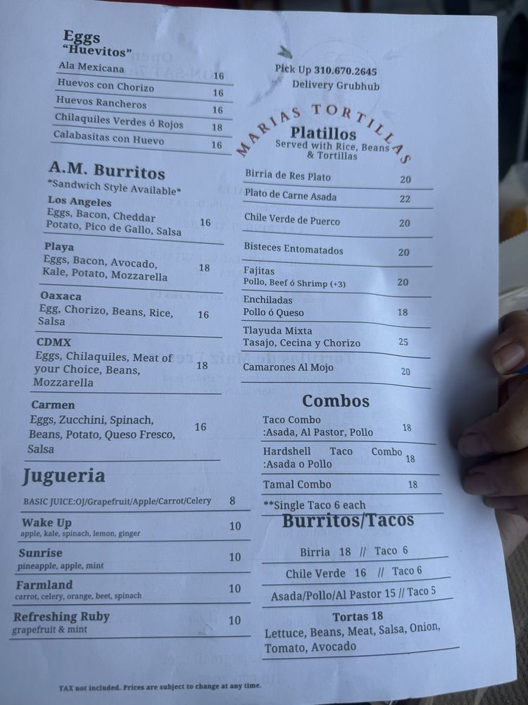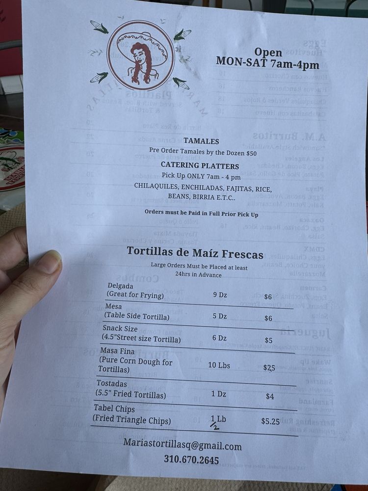 Maria's Tortillas Menu (Update 2025)